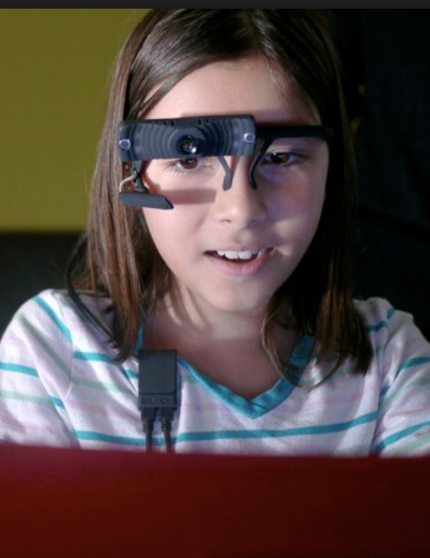 We record eye movements with high-speed eye-trackers, which are sometimes worn on the head. They are safe, comfortable, and look super cool on kids!